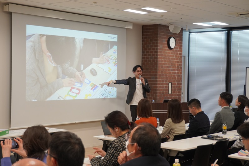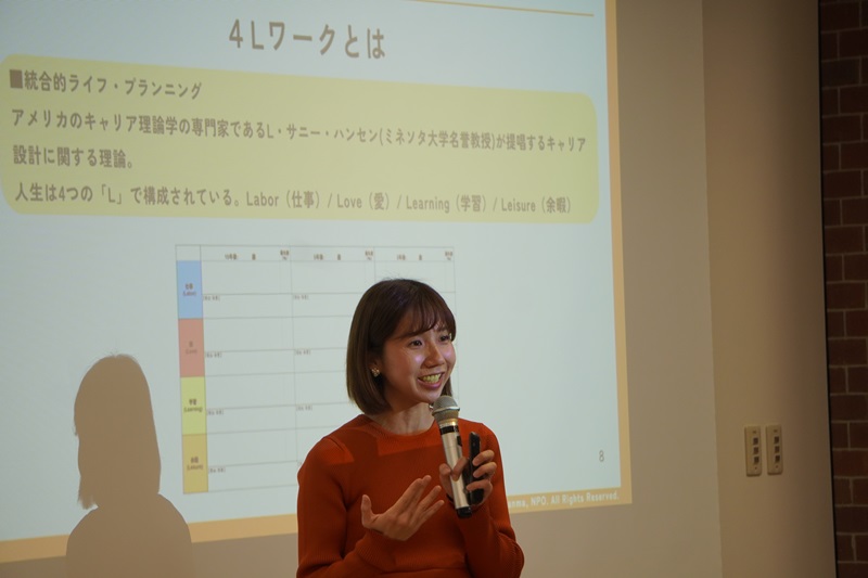 manmaでは、大学生や若手社会人向けのライフデザイン研修を実施しています。この日は、大手企業で入社5年目の社員を対象に行った研修の事例を紹介しました。内容は、「4Lワーク」という、仕事、愛、学習、余暇の4つの観点から10年後の自分を考えるもの。manmaの越智さんは「このワークは、まずは頭の中にある漠然としたモヤモヤや不安を言語化して可視化してもらうためのものです。ライフデザインや働く理由の明確化につながり、働く意欲に直結すると考えています」と話しました。